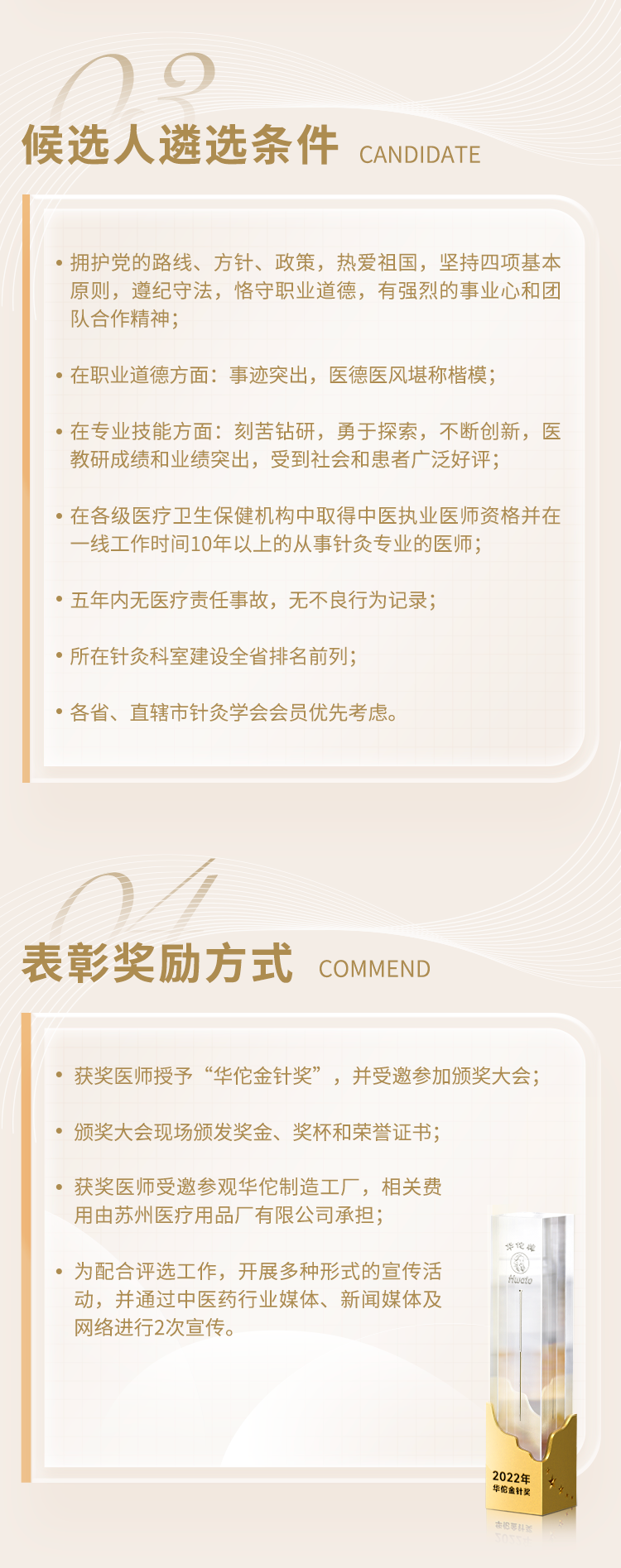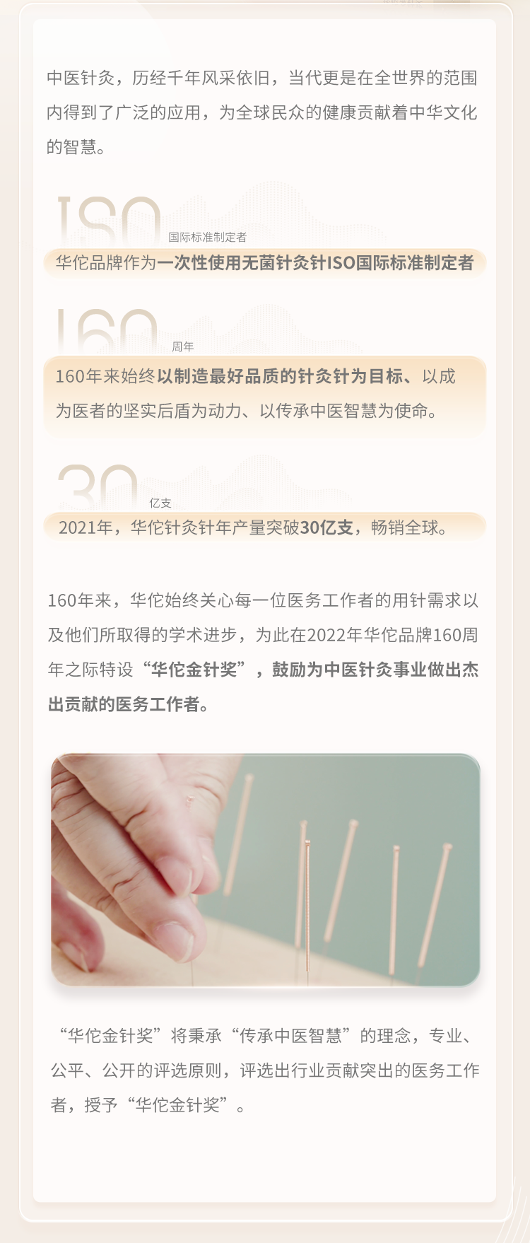 160年来,华佗始终关心每一位医务工作者的用针需求以及他们所取得的学术进步,为此在2022年华佗品牌160周年之际特设“华佗金针奖”,鼓励为中医针灸事业做出杰出贡献的医务工作者。